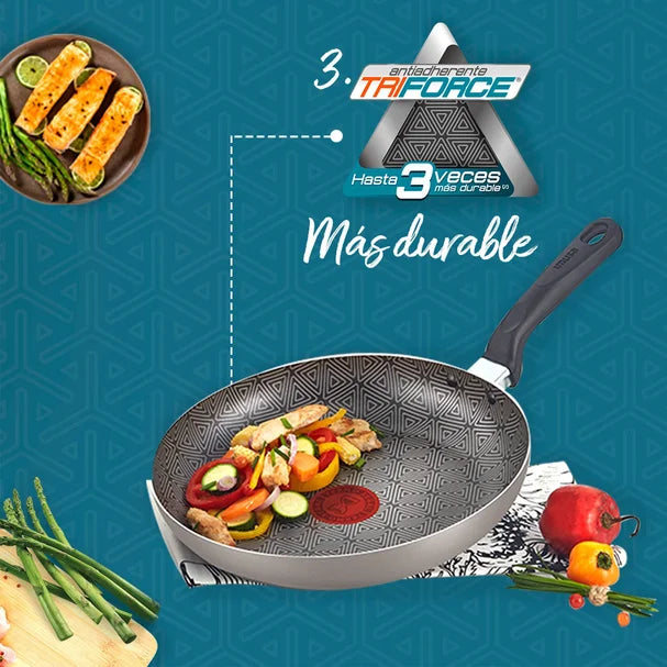 Haz de cada comida una experiencia práctica y deliciosa. Esta batería combina durabilidad, diseño moderno y un recubrimiento antiadherente Triforce, ideal para cocinar con menos aceite y limpiar fácilmente.