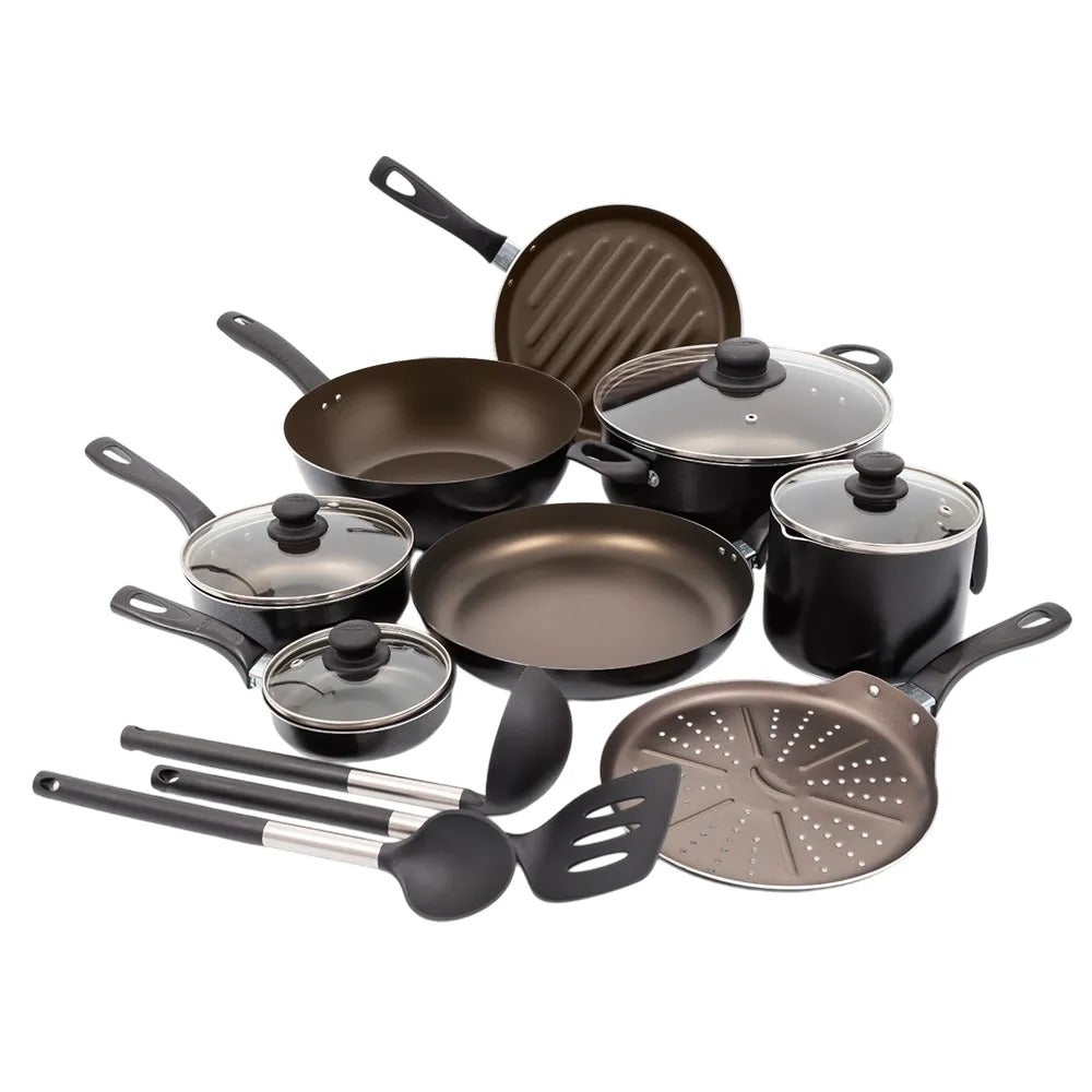 Batería momento toda ocasión llega para acompañar tus mejores momentos, esta compuesta por: - Sartén 24 cm - Wok 24 cm -Plancha asadora 23 cm - Olla 24 cm + tapa de vidrio - Perol 16 cm + tapa de vidrio - Cacerola 12 cm mango + tapa de vidrio - Parilla de arepas antiadherentes - Jarro lechero + tapa de vidrio - Accesorio pala esencial - Accesorio cuchara esencial - Accesorio cucharon esencial