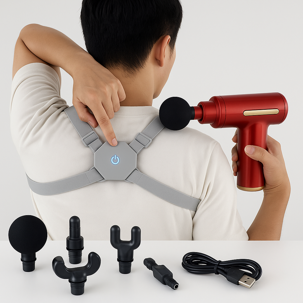 Incluye: Pistola Masajeadora Inalámbrica + Corrector de Postura Digital.