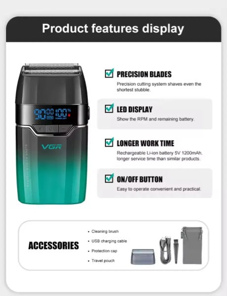 🌀 Afeitado potente y al ras con la VGR V-308: 9000 RPM y cabezal giratorio que se adapta a cada contorno para una experiencia suave y precisa. ✨ Compacta, inalámbrica y con dos posiciones de corte para personalizar tu estilo. Ideal para uso diario o llevar de viaje. ¡Calidad profesional en cada pasada! 🔋🧳