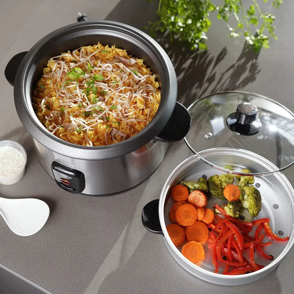 Olla Arrocera Universal INOX 2 Libras Prepara arroz perfecto y mucho más con estilo y practicidad. Su capacidad de 2 libras es ideal para toda la familia, mientras que su cuerpo en acero inoxidable aporta durabilidad y elegancia a tu cocina. Cuenta con recipiente antiadherente removible, tapa de vidrio templado y vaporera para cocinar al vapor tus alimentos favoritos. Además, mantiene el arroz caliente automáticamente hasta el momento de servir.