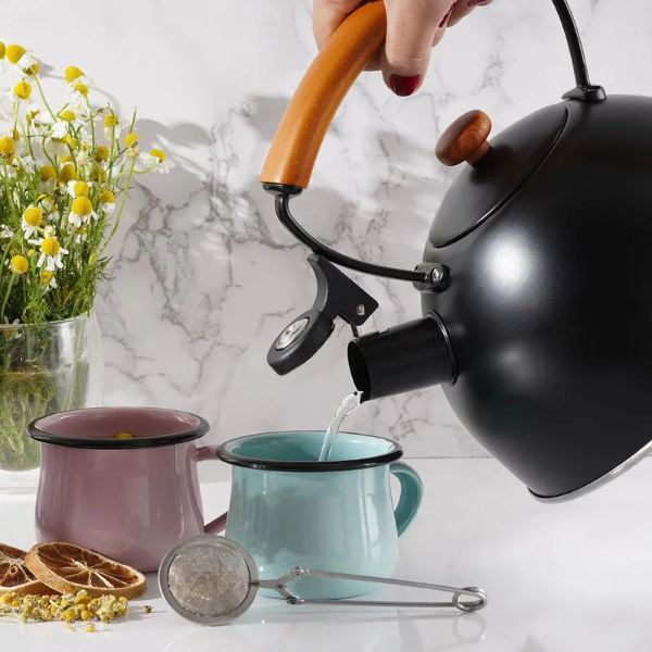 Capacidad de 2.3 litros, cuerpo en acero inoxidable y boquilla silbadora que avisa cuando el agua hierve.