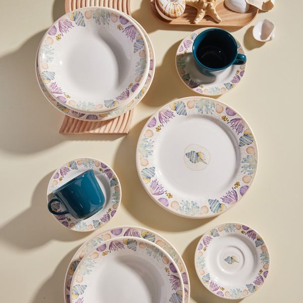 Descubre la vajilla Bahari de Corona: 16 piezas para 4 puestos con diseño inspirado en los arrecifes, donde los patrones de corales y conchas llenan tu mesa de frescura y estilo.