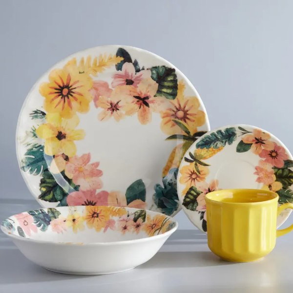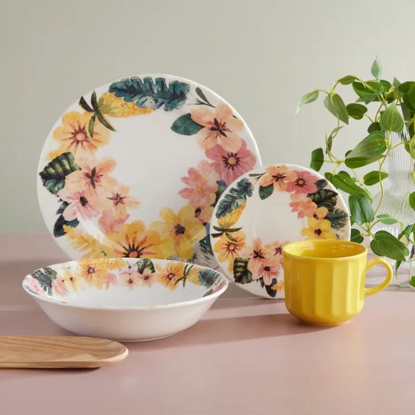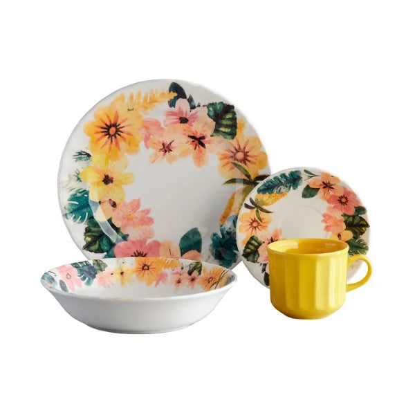 Vajilla Corona Caribeña de 16 piezas para 4 puestos, con diseño floral colorido que evoca el sabor del trópico. Fabricada en loza cerámica de alta calidad, apta para microondas y lavavajillas. Ideal para el uso diario o para sorprender a tus invitados con una mesa llena de vida. Una colección vibrante que transforma cada comida en una celebración caribeña.